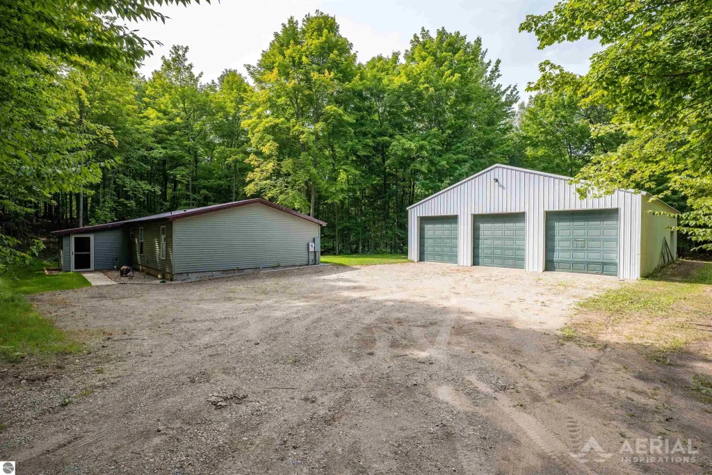 Beautiful 3 bedroom, 2 full bath home on almost 10 heavily wooded acres! Updated kitchen with gorgeous cupboards, island area with seating and stainless steel appliances. New carpet/flooring throughout. Primary bedroom has its own bath with knotty pine accent wall. 40x60 Pole Barn with cement floors, finished and power. Close to State Land for the outdoor enthusiast and hunter. New well, septic and electric service. Deck to sit back and relax. Watch the wildlife in your own back yard! Peaceful and quiet setting.