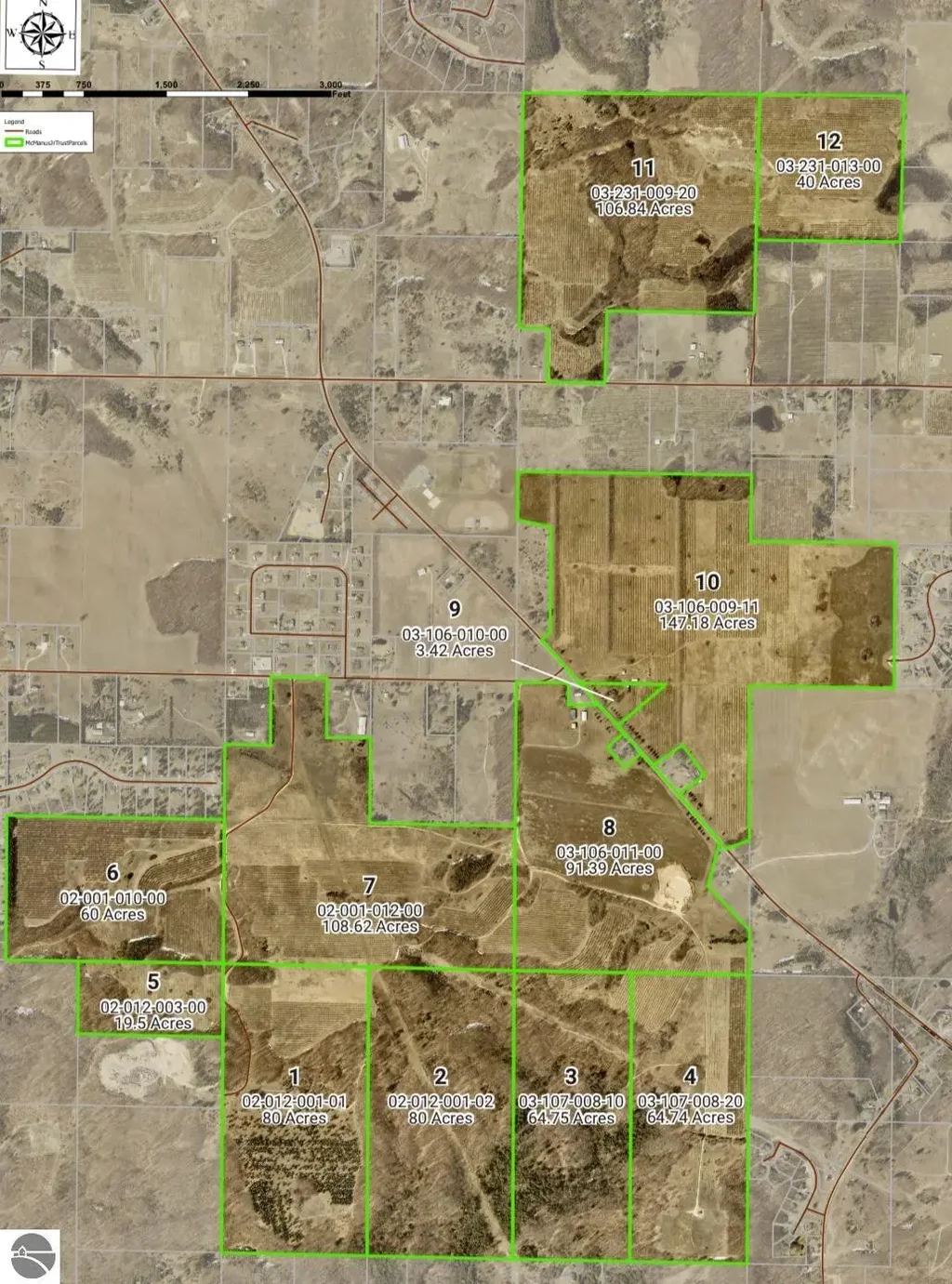 Expansive Acreage. This 147 A parcel is part of an 865 A estate, all will be sold. Splits are available. Embrace the tranquility of country living with ample agricultural land, outbuildings, and a dedicated garden area, all while being conveniently close to town. Farm house is listed MLS# 1926623. This property is also suitable for development with access on Garfield Road and through Erin Glen Subdivision off Three Mile Rd. Cherry trees and stumps have been removed. Land is currently being farmed in corn.