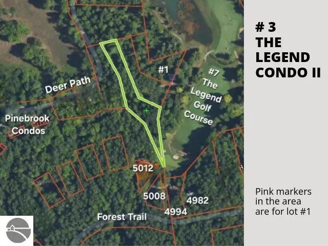 PRICE REDUCED and perfect for enjoying beach club access on Lake Bellaire and the Pinebrook outdoor pool and tennis courts. Legend Condo II, Parcel #3, is approximately 1 wooded acre with the Shanty Creek running across the land. This elongated and uniquely shaped parcel is less than half mile from M-88 yet it provides a sense of seclusion. The tip of the parcel touches The Legend Golf Course. As a point of reference, the pink survey tape is for parcel #1 (see photos). The parcel is off of Deer Path (a paved road) and there is a 2-track off of Deer Path that is used to gain access to this area. Annual HOA dues are only $246 with a one-time road assessment of $50.