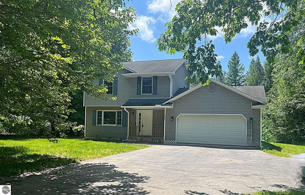 Move-In ready 3BR, 2.5BA 2-story hidden gem on a 1acre level lot with beautiful mature hardwoods and white pines plus a backyard with large open space complete with garden space, playground area, fire pit and garden storage shed. So many updates and improvements: Septic pumped 9/2025. Furnace and A/C, Total Kitchen remodel(cabinets, undercabinet lighting, quartz countertop, back-splash, lighting, appliances, LVP on the main level, Carpet replaced upper level. The lower level is a great work-out area, rec space with a ¾ bath and non-conforming room. Mechanical in the lower featuring updated furnace w/air conditioning. The oversized 2-car garage is heated and opener is wifi. A service entrance off the garage opens to a large covered deck area perfect for entertaining – rain or shine! A must see, quiet neighborhood, located between Chums Corners and Interlochen…a true find!