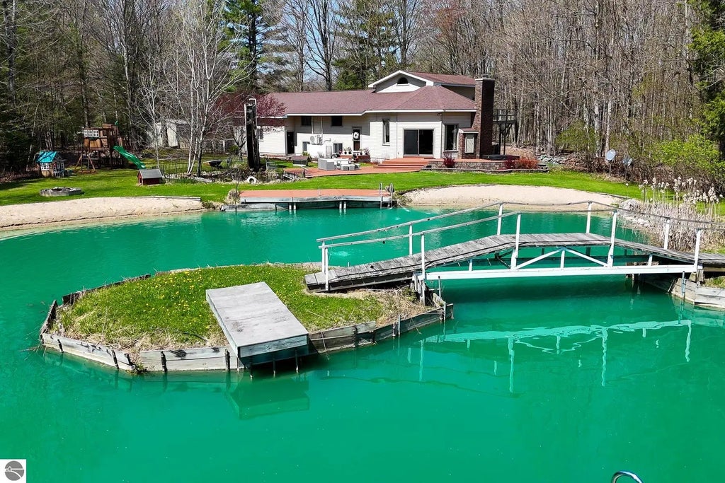 A water-feature paradise that is nestled on 3.45 acres along 142 feet of the breathtaking Manistee River, this 4-bedroom, 3.5-bath home offers a one-of-a-kind blend of natural beauty and comfortable living. Enjoy your own swimmable, spring-fed pond complete with fish, two sandy beaches, and even two artisan fed, whimsical waterwheels. Whether you're kayaking through the peaceful neighborhood or relaxing on your private shoreline, this property is truly a nature lover's haven. Inside, you'll find stunning wood floors, solid surface kitchen counters, and a massive primary bedroom ready for your personal touch. The attached 2-car garage is complemented by an additional detached 2-car garage—perfect for extra storage or workshop space. With tranquil surroundings, unmatched riverfront access, and endless opportunities for outdoor adventure, this home is the ultimate escape with all the comforts you need.