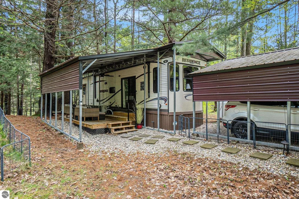 Discover an exceptional opportunity in the Rose Lake Development with this beautifully set-up destination trailer on two lots, offering full hookups to a private well, septic, electric, and backup generator. This 1-bedroom, ¾-bath residence features a spacious living area that opens onto a covered deck and patio—ideal for year-round living or seasonal use. Inside, you'll find the convenience of in-unit laundry and thoughtful design throughout. The property also includes multiple outbuildings: a home gym with TV, a second shed previously used for a hot tub with upper loft storage, and two additional sheds perfect for tools and equipment. Ownership includes shared access to Rose Lake, a 370-acre all-sports lake, along with use of the sandy beach, pavilion, showers, restrooms, and parking lot. This property offers both comfort and flexibility in a vibrant lake community. For more information about the Rose Lake Forest Property Owners Association, https://rlfpoa.com/ . A full list of the property amenities is available upon request.