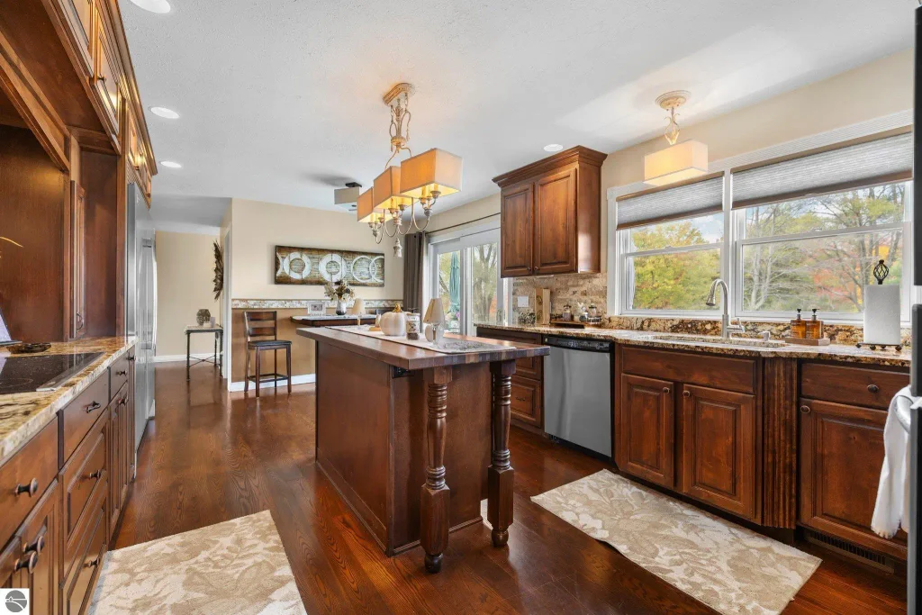 In the enclave of Bahia Vista, just ten minutes from downtown Traverse City, lies a residence crafted with intention and distinction. Designed and built by a respected local builder for his own family, this 5-bedroom, 4.5-bath estate rests on 1.7 acres and showcases enduring oak trusses and fine finishes that speak to timeless quality. The heart of the home is a chef’s kitchen appointed with granite surfaces, custom cabinetry, and professional-grade appliances, perfect for both intimate gatherings and grand entertaining. The primary suite offers a private sanctuary, while an expansive loft adds 700 sq. ft. of versatile living space for a library, studio, or retreat. An attached guest residence provides refined accommodations for extended family or offers the opportunity for discreet rental income. Outside, the grounds provide a sense of privacy and quiet elegance, all within moments of Traverse City’s culture, dining, and waterfront. This is more than a home, it is an estate of substance and style in one of the region’s most desirable settings.