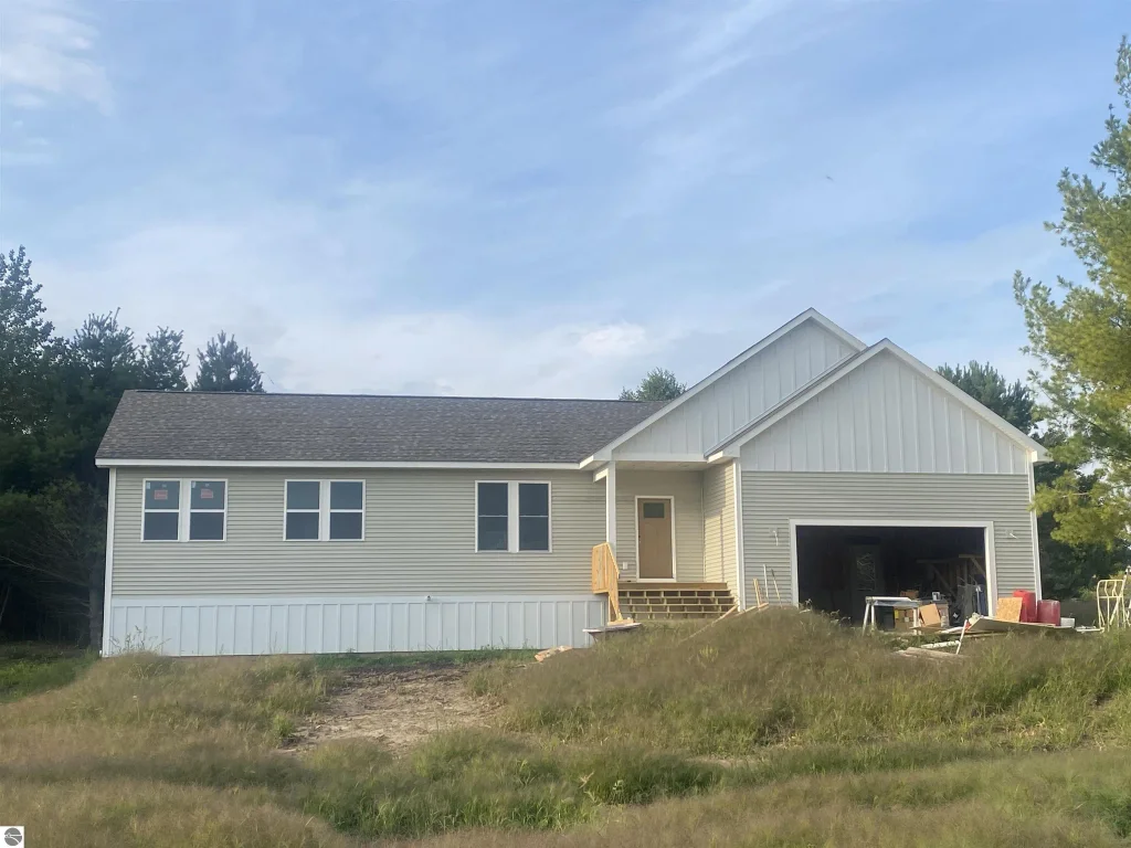Exceptional location situated between Elk and Torch Lakes, featuring beautiful cherry orchard views. This newly constructed ranch-style home includes three bedrooms and two bathrooms, along with an attached two-car garage. The main floor offers a primary bedroom complete with a private bathroom and a tiled shower. The full walkout lower level is ready for finishing and is framed and plumbed for a third bathroom. Enjoy central air conditioning, cable internet, and natural gas, along with butcher block countertops and durable waterproof flooring. The home boasts cathedral ceilings and custom handcrafted cabinets, all on over two acres where outbuildings can be built. Short-term rentals are permitted. The home is energy efficient with R21 insulation in the walls and R49 in the attic, featuring sturdy 2 by 6 construction. Kitchen appliances are included, and the furnace has a 96 percent efficiency rating with a 50-gallon water heater. The annual association fee is $200, and the estimated completion date is August 30, 2025. The seller holds a real estate license. Consider purchasing now to choose some of your finishes.