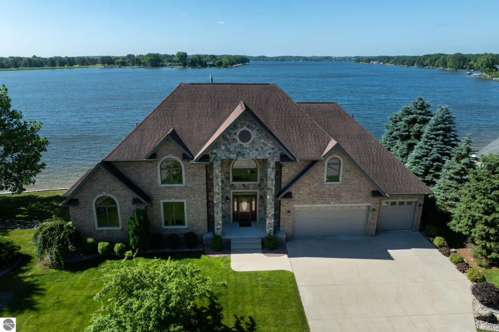Welcome to luxury lakefront living at its finest! This beautiful waterfront home is located on Lake Isabella, a private 800-acre all-sports lake. This 4-bedroom, 4.5-bath custom residence with a 3-car garage sits on a professionally landscaped 1-acre lot with 210 feet of shoreline. Built to the highest standards, the home features a brick and real stone façade, granite countertops throughout, and a stylish blend of ceramic tile, marble, hardwood, and carpet. The grand two-story foyer opens to a spacious great room with cathedral ceilings, a natural stone fireplace, and a dramatic wall of windows showcasing breathtaking lake views. The open-concept layout connects the great room, breakfast nook, and kitchen, which features a lake-facing center island. A formal dining room and wood-paneled study—both with water views—offer additional elegant living spaces. The first-floor primary suite includes cathedral ceilings and a walk-in closet, while the second floor boasts a guest suite with a private lake-view balcony. An exposed catwalk connects the suite to a large loft, two additional bedrooms, a full bath, and a second study. The finished walkout lower level is ideal for entertaining, offering a wet bar with granite counters, pool table, home theater with Bose sound system, and an infrared sauna. A sliding door leads to a patio, stone-lined seawall, and sandy beach. Energy-efficient with 2x6 exterior walls, Anderson windows, geothermal heating and cooling, and a standby whole-house generator. Enjoy over 500 sq ft of composite decking across the lakeside of the home. As a member of the Isabella Property Owners Association, you’ll have access to The Pines Golf Course with clubhouse and restaurant, private airstrip, tennis courts, 22+ parks, and a campground with adjacent storage facilities. This home blends timeless elegance with modern comfort.