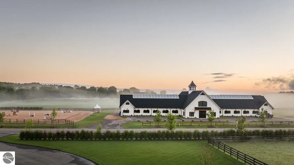 Luxury equestrian facility in Grand Prix Village North, Northern Michigan’s premier gated equestrian community. This recently completed 10,858 sq ft custom barn by B&D Builders sits on a high-visibility lot with direct access to Flintfields Horse Park via private bridle paths, while still offering the privacy and security of a gated setting. The barn includes 22 stalls, 4 wash stalls, 4 grooming stalls, feed room, hay storage, laundry room, bathroom, and office. A separate three-car garage includes a well equipped 4-bedroom, 2-bathroom apartment above, perfect for staff or guest accommodations. (Skylights will be installed on the barn in mid-July) The property is fully fenced and professionally landscaped, featuring a 185' x 175' riding arena with an ebb-and-flow watering system and four 60' x 60' fenced paddocks. Grand Prix Village North was designed by equestrians to support a premier equestrian lifestyle, with luxury barns and homes, paved roads, and a private network of bridle paths connecting to the showgrounds. Utilities at the site include electric, natural gas, and high-speed internet. Whether you’re a competitor, trainer, or equestrian enthusiast, this is a rare and exceptional opportunity to own a top-tier facility in one of Michigan’s most sought-after equestrian communities.