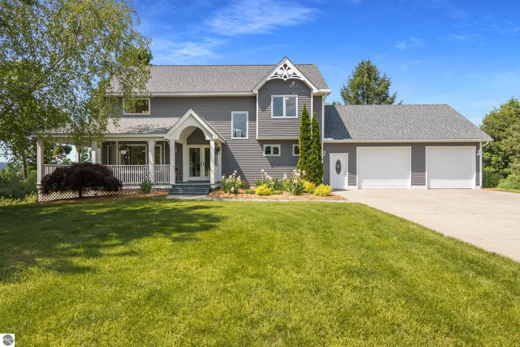 If you've been in search for the perfect home in Leelanau County with room to roam, that offers privacy, room for family & friends, a water view, come have a look at this stunning home! A farmhouse feel, with covered porch & architectural flair, this centrally located gem is just minutes from clear inland lakes & Lake Michigan, wineries, Leland, Glen Arbor, the Sleeping Bear Dunes National Lakeshore, and so much more.. This spacious home features a large kitchen with granite counter tops, breakfast/informal nook, formal dining area & newly refinished hardwood floors, lovely great room with cathedral ceiling & cozy wood burning fireplace, perfect for those winter nights, & tall Christmas trees. You'll enjoy the convenience of the main level laundry room & office/den/potential bedroom. Three bedrooms occupy the upper level, including the spa-like primary suite with soaking tub & tile shower, and private balcony to gaze at the lake views & the stars after dark... The lower level family room is the perfect spot for the big game or family movie nights. The sellers say, "this property is magical, sunsets, fall colors, wildlife galore, bald eagles, the privacy, trails for hiking and snowshoeing, it's like being on vacation year around!" Plenty of outdoor living spaces enjoy nature, large main level deck that overlooks a small pond/water feature, intimate patio off the lower level too, a great property share with those you love! This property is being offered with a total of 4 parcels, the house with 3+ acres, but has 39 more acres to the east, west, & north, to insure ultimate privacy & all kinds of outdoor pursuits, all with potential water views. There's a great area one could create a tennis or pickleball court, volley ball, continue the gardens, or?? You'll never tire of exploring the diverse meadows, mixed conifer & hardwood forests that are a part of this special listing.