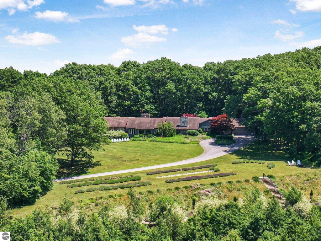 Presenting a once-in-a-lifetime Leelanau County estate with unmatched water views and unique short-term rental/B&B potential. Perched atop nearly 19 acres of rolling, private land, this extraordinary 6-bedroom, 5-bathroom ranch estate offers panoramic views that are simply unparalleled. Truly one of the most unique and impressive views in the county with sweeping vistas of Lake Leelanau, Lake Michigan, the Manitou Islands, and the sand dunes of Pyramid Point — all from a single, breathtaking vantage point. Watch colors change and sunlight dazzle on the water, ending each day with a spectacular sunset over Lake Michigan. Other property features include a 24x30x18 steel barn, active lavender garden, a terraced garden, recently planted grape vines and an expansive back deck overlooking a small pond with waterfall feature. Designed with a timeless blend of classic architecture and mid-century modern charm, this 5,040 sq. ft. property is currently a full time primary residence while also operating as a successful bed and breakfast, thoughtfully divided into an “owner’s side” (2 bed/2 bath) and a “guest side” (4 bed/3 bath). The layout of the home allows for new owners to easily continue the bed and breakfast operation or instead use the entire home as a personal estate. The extravagant chef’s kitchen (literally.. the home was originally owned by a retired White House chef!) with Thermador appliances, a large island and butler’s pantry is perfectly set up for hosting and cooking for large gatherings. Features include double wall ovens, a 6 burner cook top, 2 built in Subzero refrigerators, 2 Subzero freezers, granite counters and beautiful cabinetry. The enormous great room is sure to be a popular gathering spot with its stunning stone surround fireplace, vaulted ceilings, extensive built-in shelving and beautiful views of the grounds & water beyond. The living room off of the kitchen features a second gas fireplace and is adjacent to one of two dining areas.