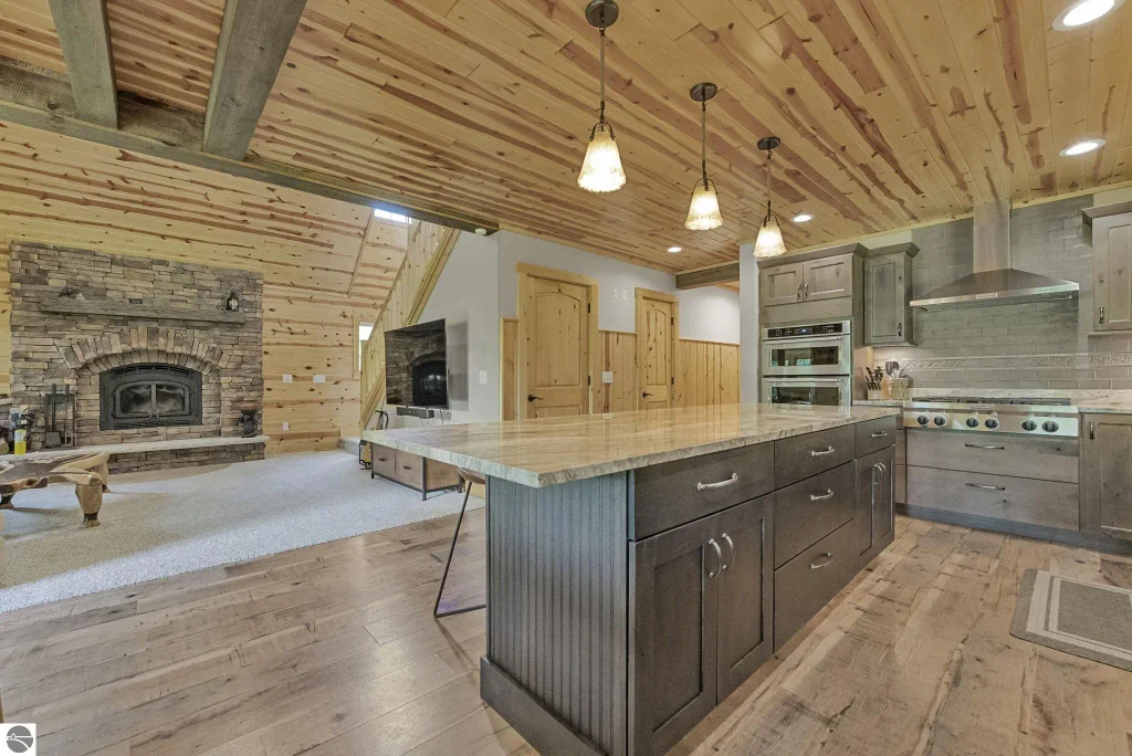 Surrounded by over 45,000 acres of pristine Michigan State land , this custom-built 2019 home in Lake Ann is the ultimate "up north" retreat. Whether you're seeking a year-round residence, seasonal escape, or recreational haven, this 5 bedroom, 5 bath home offers unmatched privacy and outdoor opportunity-ideal for hunting, hiking, ORV riding, snowmobiling and more. This is so thoughtfully designed from a main floor covered deck and a beautiful three-season sunroom that offers both the feeling of bringing the outside in as you relax and enjoy the quiet nature views in a covered living space. Solid pine doors, ceilings and trim detail will grab your attention the minute you enter this beautiful home as every inch exudes warmth and craftsmanship. The elegant quartzite countertops thorough-out elevate the aesthetic, blending the rustic charm with modern luxury. A stunning combination. Enjoy the custom kitchen, cozy up next to one of two fireplaces, or head downstairs to the finished walkout lower level with a pool table area and large second family living space perfect for entertaining. This is set in a truly remarkable location with endless recreational potential, offering peaceful serenity when you need to get away, style and adventure all in one.