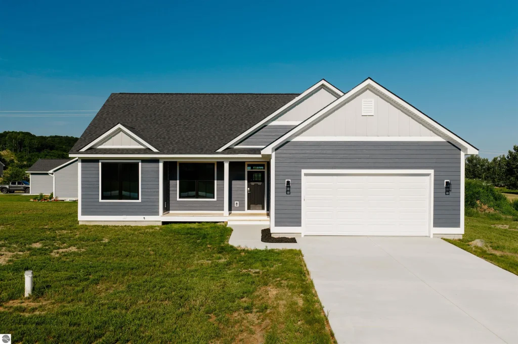 Modern design, upscale finishes, and a layout that just makes sense. This brand-new home blends style and function effortlessly. From the LP Smartside siding and black window package to the covered front porch, every detail was thoughtfully chosen. Inside, you’ll find vaulted ceilings, solid core doors, and central air for year-round comfort. The open layout flows from a custom kitchen—complete with premium cabinetry, KitchenAid appliances, and a spacious island—into bright dining and living areas with Shaw luxury vinyl plank flooring throughout. The private primary suite includes a sleek en-suite bath with custom tilework and a walk-in shower. A finished 24’ x 24’ insulated garage adds convenience, and the full lower level with two egress windows is ready for future expansion. Enjoy a quiet backyard setting just minutes from both Traverse City and Kingsley. Clean, stylish, and move-in ready. This one nails it.