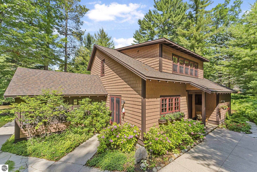 Coveted Crystal River Retreat in Beautiful Glen Arbor. Nestled along the serene and scenic Crystal River, this stunning Easling-built home offers 150 feet of pristine frontage with a private dock—perfect for watching kayaks and canoes drift by. Located on a quiet dead-end road, just a peaceful walk or bike ride to charming Glen Arbor, this property combines tranquility with convenience. Step inside to find gorgeous wood floors, soaring beams, and exquisite wood ceiling details that showcase craftsmanship at every turn. A stunning staircase leads to the upper level, blending beauty and function. A stone fireplace with custom built-in bookshelves anchors the inviting living area, while a cozy loft with a daybed offers the perfect spot for reading or afternoon naps. The home features 3 bedrooms, 3 baths that includes a charming garage apartment with its own bedroom and full bath—a private retreat for guests. Enjoy incredible outdoor living with thoughtfully designed landscaping and an unreal screened porch where you can relax, listen to the birds, and watch the river activity. This is a rare opportunity to own a quiet, well-appointed riverfront home in one of Glen Arbor’s most sought-after settings.