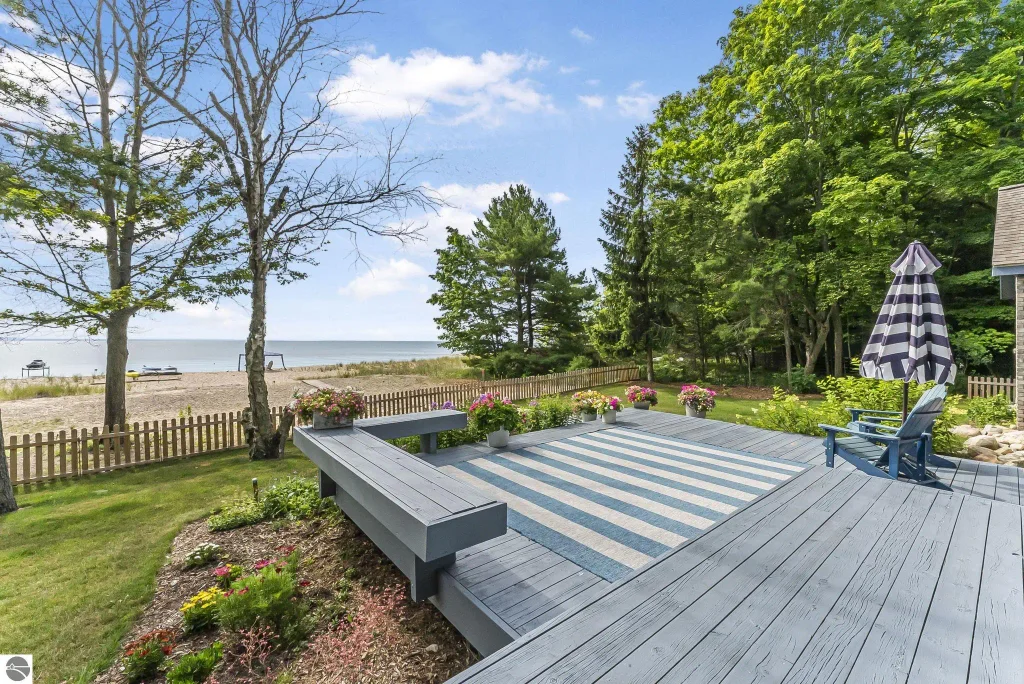 Nestled along a serene, shallow cove in the heart of Cherry Home Shores, this charming 4-bed, 2.5-bath home offers 95 feet of shoreline with sweeping easterly views and the feel of a protected bay. Set on two generous parcels, the property features a lush grassy lawn, mature trees, and a handsome stone wall which creates separation from the road. Lakeside, a spectacular deck overlooks the landscaped yard to the water beyond. Follow the boardwalk across the deep, sandy beach to the shore - here, it's a rock-hunter's paradise! Inside, comfort and thoughtful design abound. The main-level living area boasts soaring ceilings, skylights, and breathtaking lake views. A gas fireplace with stone surround anchors the room, and adds intimacy and warmth to the space. Entertaining is a breeze here - prepare dinner in the beautiful island kitchen and enjoy your meal in the adjacent dining room or on the deck. Take note of the incredible screened in porch - a perfect setting for lakeside coffee or evening cocktails. Find privacy in the main-floor primary suite - this room enjoys views of the water and includes a walk-in closet and generous bathroom. Across the hall, a quiet office (or bedroom) adds flexiblity to the home. The second level landing overlooks the main living area and could be a lovely reading nook or play space. Two bedrooms flank either side, each with operable skylights that frame glimpses of the lake. Above the garage is a surprise bonus room, presently used as an artist’s studio. This area could easily serve as a bunk room, bedroom, or private office. Storage in this home is plentiful, including attic nooks, generous closets, an oversized 2.5-car garage, and basement with both interior and exterior access. A few recent updates to this home include a whole-house generator, wood flooring, induction cooktop, newer furnace, and mini-split system above the garage. This is wonderful, well-rounded home, perfect for year-round living or your up north retreat!