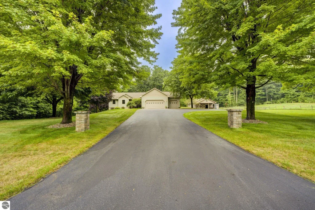 Experience refined living in this custom-built ranch, perfectly set on over 4 acres just 20 minutes south of Traverse City. A welcoming covered porch leads to a light-filled interior, where gleaming maple wood floors and an open floor plan create an inviting, yet elegant atmosphere. The gourmet kitchen boasts stainless steel appliances, rich hickory cabinetry, a pantry with custom pull-out drawers, and a charming breakfast nook. Living and dining areas flow seamlessly to a newly replaced deck overlooking the fenced backyard—ideal for entertaining or quiet evenings at home. The primary suite offers a private retreat with deck access, a tiled ¾ bath, and a spacious walk-in closet. Two additional bedrooms feature custom closets and share a beautifully appointed full bath. The unfinished walk-out basement, plumbed for a third bath and wet bar or mini kitchen, presents endless possibilities for expansion. Outdoors, enjoy a custom fire pit for cozy gatherings and a large shed-style chicken coop for farm-to-table living. The fully finished 3+ car garage, wood boiler for barn heating, and thoughtful touches like power at driveway brick columns and outlets for seasonal décor add to the property’s appeal. This home is a perfect blend of comfort, elegance, and thoughtful design—a must-see to appreciate every detail. *The NEW back deck was just completed, and photos will be updated.