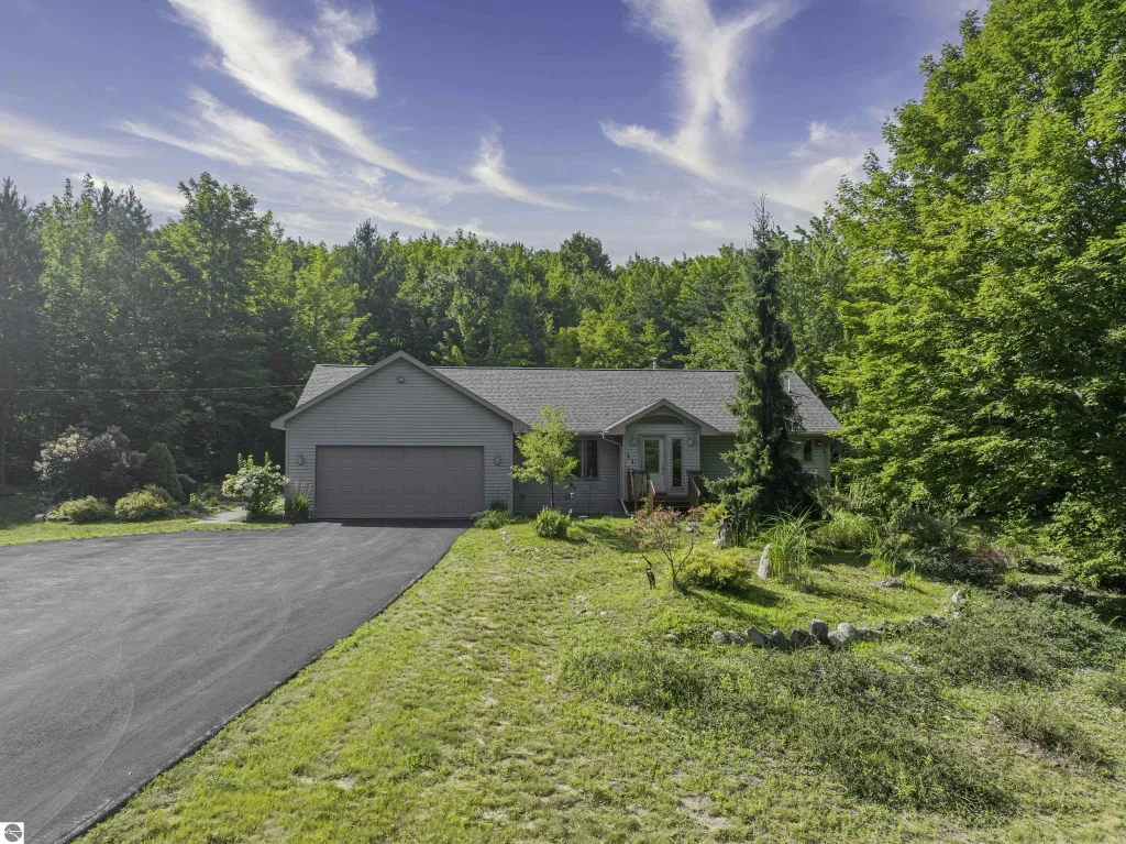 Nestled in a private wooded setting with nearly 6 acres. This well cared for ranch style home offers the perfect balance of comfort, privacy and peacefulness. Step inside to an inviting open living, dining, kitchen area featuring Brazilian Cherry hardwood floors and a cozy two-sided fireplace that warms both the living room and the primary bedroom with private bathroom suite. This 4 Br 2.5 bath home includes main floor laundry room for everyday ease. The lower level provides 2 additional bedrooms including a walkout, making it ideal for guests, family and a non conforming bedroom for flexible use. Enjoy the outdoors on the expansive brick pavered patio, where you can take in the beauty of nature right at your doorstep. Additional highlights include a GENERAC system for peace of mind and a garden shed for added storage. All this and more! Located near Interlochen and only 30 minutes from downtown Traverse City.