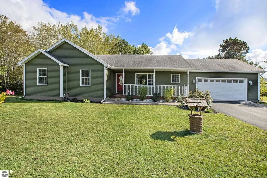 Welcome to this beautifully updated 3-bedroom, 2-bath ranch nestled on 1.55 acres in the desirable Glacier Ponds neighborhood. Thoughtfully designed for comfort and style, this home blends modern updates with an open, inviting layout. The main living area features cathedral ceilings, a natural gas fireplace, and oversized Andersen windows that fill the space with sunlight. Step out from the living room onto the sunny, south-facing deck — ideal for morning coffee, summer barbecues, or simply enjoying the peaceful surroundings. The chef’s kitchen is both functional and stunning, with quartz countertops, a farmhouse sink, touchless faucet, soft-close cabinetry, an upper-end Bosch induction cooktop, and double wall ovens. Additional updates include new vinyl siding, a new furnace, central air, and numerous other thoughtful improvements throughout the home. The walkout lower level opens to the backyard from the family room, offering flexible space for a home office, playroom, guest retreat, or your own creative vision. It is already plumbed for a full bath, providing easy options to expand living space. The home is also plumbed for a main-floor laundry in addition to the current lower-level setup. Outside, enjoy a large partially wooded yard, a new shed, and the serenity of a cul-de-sac location among quality homes. All this is just minutes from the amenities of Traverse City - the perfect combination of privacy, comfort, and convenience.