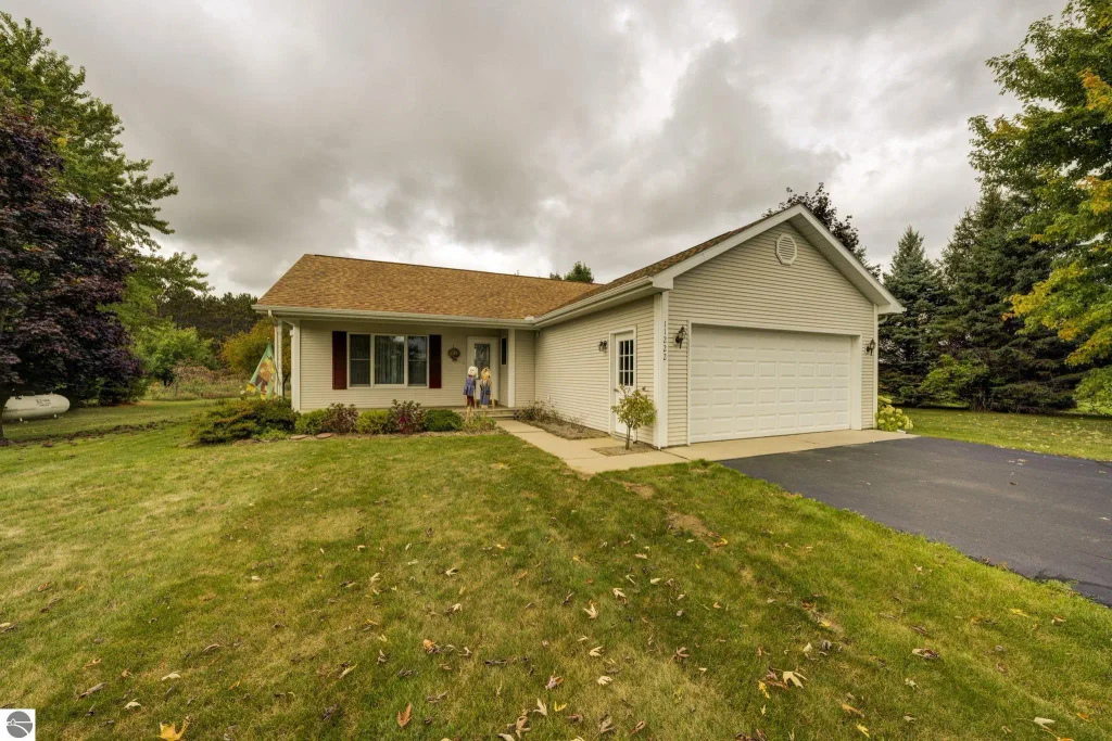 Well maintained ranch style home with all main floor living situated on 10 acres. The covered front porch greets you. Stepping into the home you will find a somewhat open floor plan with a nice sized living room offering plush white carpet, tiled gas fireplace and large daylight windows. You will appreciate the coat closet to keep all items put away and organized and the adjacent mudroom / laundry room with washtub and stackable washer & dryer. The kitchen overlooks the backyard and offers nice cabinetry with a pantry that has pull out drawers, two Lazy Susans, dishwasher and a breakfast bar. The dining area has a slider door that leads you out onto the back deck, facing west, for viewing those beautiful sunsets over the farm field. Walking down the hallway you will find a full bath and the 2nd bedroom along with the primary ensuite offering a TV nook, walk-in closet and a private 3/4 bath. Back out through the mudroom, there is a door that will lead you the stairs to the un-finished lower level where you can envision a future build out or continue to use as a storage room. Also from the mudroom, there is a door that leads you to the attached finished garage which has a side service door for convenience and a handicap ramp that can easily be removed.