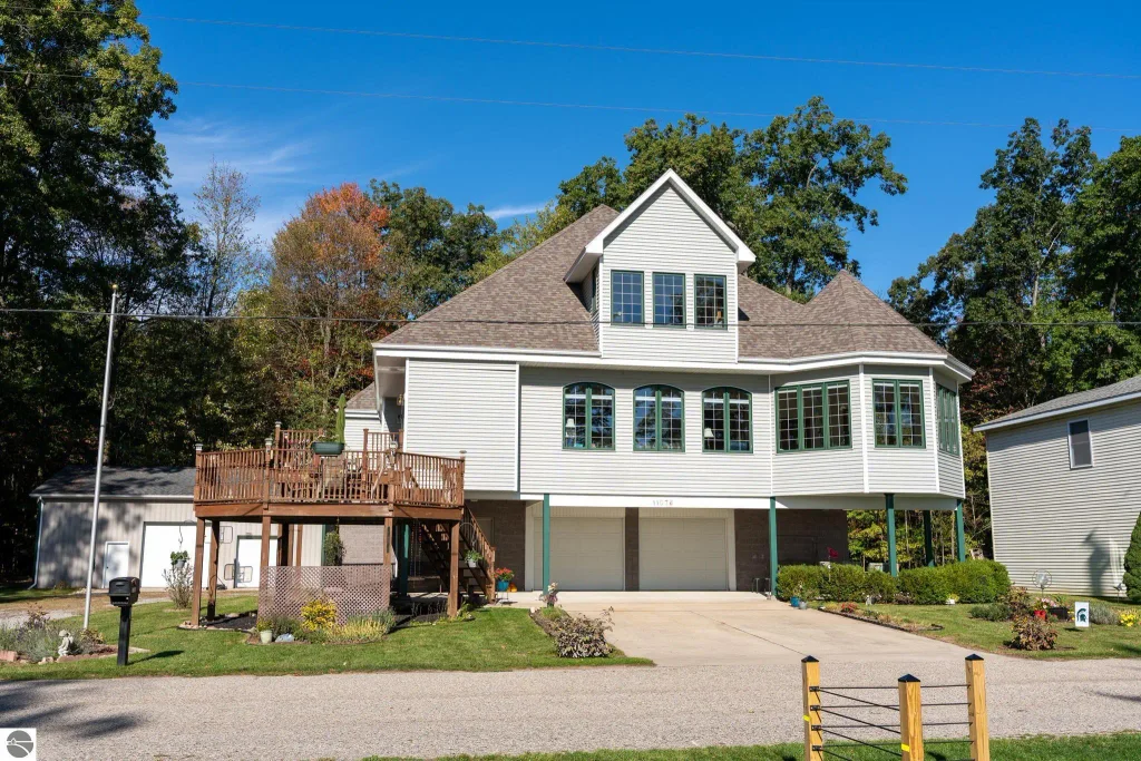 First time offered for sale. Don’t miss this opportunity to own a one-of-a-kind 4+ bedroom, 3-bath home with over 3,000 square feet of living space on beautiful Eight Point Lake. Includes 25x111 of private lake access to design your dream gazebo, outdoor kitchen, or entertaining space. Enjoy off-water taxes while still capturing spectacular lake views! This unique build includes a ground-level, 31x42 two car garage with room for vehicles, storage, and toys, plus mechanical room. A recently installed Generac 24k whole-house generator ensures peace of mind. From the garage, access the home by elevator or take the stairs up freshly stained multi-level decks to the main entry. The main level features a nearly 400 sq ft primary suite, complete with French doors leading into a 300 sq. ft. polygonal bay room where you’ll enjoy breathtaking sunrises and water views. The kitchen and dining areas feature cathedral ceilings, a large island with additional seating for five, and access to the large lake facing deck. The living room includes a natural gas fireplace for winter evenings, and french door access to the bay room. Two additional bedrooms, one with direct access to the back deck, along with a second full bath and large laundry room complete this level. Upstairs offers more cathedral ceilings with space to relax and entertain: an additional bedroom, full bath, wet bar, game room, family room, generous storage areas, and more breathtaking water views. The large lot provides expansive green space along with a 42x32 pole barn featuring 13 ft sidewalls, concrete approach and floors, 8x8 and 10x10 overhead doors, two service doors, and 100-amp panel. Eight Point Lake is known for excellent fishing, water recreation, sandbar gatherings, golf cart rides, summer concerts, and holiday events, including the July 4th 5k and Labor Day fireworks. Whether for seasonal use or year-round living, this home offers a great opportunity to enjoy all that lake living has to offer.