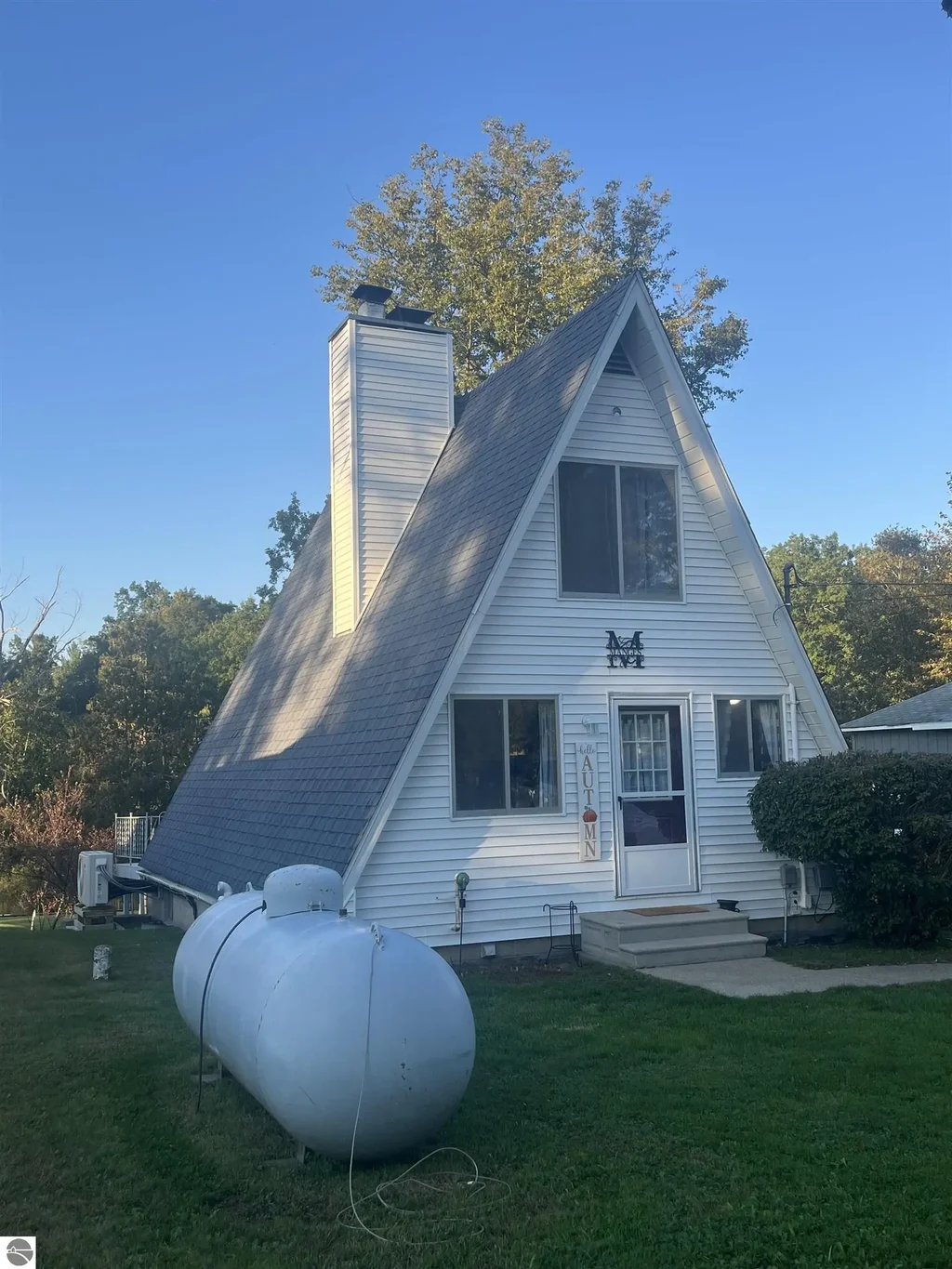 This A-Framed home is cute as a button. Not only does it offer river frontage but it also come with the dble lot across the road with a 2 car garage on it. The living room is very spacious for your lounging needs with a great view of the river. The 2 bedrooms upstairs has plenty of closet space in the hallway. Sellers are using the large space in the walk out basement for a master bedroom, which could easily be a family room or game room if you choose instead. there is lots of storage space in the basement as well. There have been many updates as well, which include newer roof (8-10 yrs) New Mini splits for heating and cooling in upper and lower levels, New gas boiler system (3 yrs), Electric panel update (1.5 yrs), New well pump and bladder tank. Come see for yourself everything thing it has to offer.