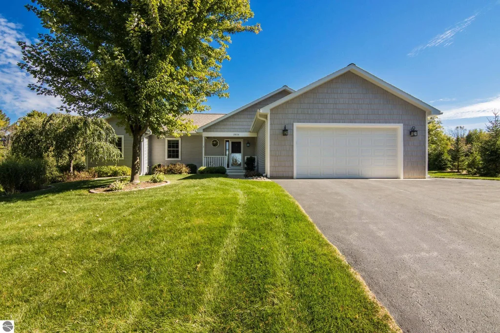 WEST SIDE OF TRAVERSE CITY discover this beautifully maintained home. Sit on the covered front porch with your morning coffee and listen to the sounds of nature on your private 1.28-acre setting. An open floor plan with cathedral ceilings, hardwood floors and fireplace in the living room; 4 bedrooms, 3 baths; owners suite with private bath; laundry room with generous cabinetry and 2-car attached garage. The cheery kitchen is enhanced by island with bar seating, stainless appliances, granite counter tops and Cherry cabinetry. The lower level features a family room and sizable workshop area plus plenty of storage space. Easy entertaining on your spacious deck and brick patio. Landscaped setting with a gorgeous lawn kept green and lush with the underground sprinkler system. Close to Long Lake beaches and boat launch, just a short drive to downtown Traverse City. You will love living in Timber Meadows Estates and this area of nice homes.