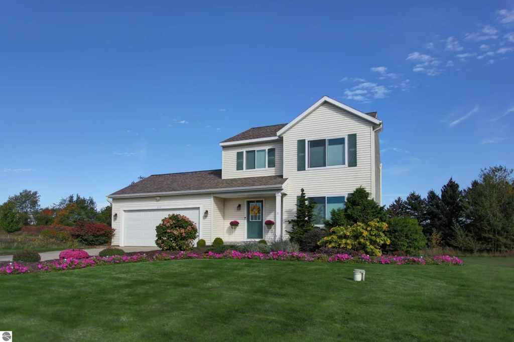 Just a drive-by will sell you on the charm of this immaculately maintained 2015 home in a lovely countryside setting! Adorned with beautiful landscaping and a lush 0.72-acre lawn (with underground sprinklers), this home is situated on an exterior lot in the development, backing to a large countryside parcel for beautiful views. Highlights of the home include a foyer entrance with a double-size closet, bar seating in the kitchen, a main-floor dedicated laundry room with an attached half bath, a shared entry bath and walk-in closet in the primary suite, two more bedrooms upstairs, and central air. The lower level is nearly finished with egress windows, room framing and exterior drywall complete; it's also plumbed for a third bath. Energy-efficient features include a 96.1% high efficiency furnace, R-50 attic insulation and R-20 closed cell expanding foam sidewall insulation. This location is super close to multiple sides of town - 5 minutes to the Cherryland Center, 5 minutes to Chums Corners, 5-10 minutes to multiple schools - but it is removed from the hustle and bustle, hosting a quiet setting for renewal and relaxation.