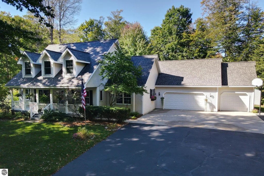 Nestled in a quiet clearing surrounded by towering mature hardwoods on nearly 5 acres, this stately 4-5 bedroom home offers an abundance of space, charm, and amenities. A spacious covered front porch greets you and welcomes you to relax for a while. The foyer entrance hosts a den and half bath on one side and a formal dining room on the other, and then opens to a living room under cathedral ceilings anchored by a stone gas fireplace. A haven of relaxation, the primary suite boasts a private bath and generous walk-in closet. You'll find two more bedrooms, a shared-entry full bath, and a small reading nook in the upper level. Truly the heart of the home, the chef's kitchen is a wonderful space to create, with a large ceramic topped island, pantry, and plenty of cabinet/counter space. The walkout level is finished with a large family room, bedroom and 3/4 bath. Enjoy private open-air dining on the large back deck overlooking the beautifully wooded acreage. There's plenty of space for parking and/or a workshop in the 3-car attached garage. Additional highlights include a new roof in 2025, central air, and hardwood floors. All this is 10 minutes to the west side of downtown Traverse City!