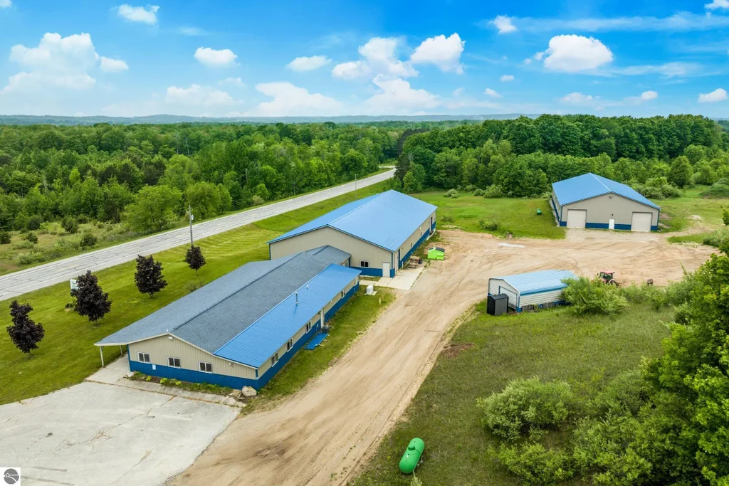Prime location and endless potential! This 16-acre (grandfathered) commercial property offers an exceptional opportunity for limited commercial use especially with an agricultural focus—perfectly positioned along M-115 just minutes from the US-31 crossroads and Benzonia. Also on the truck route for US 131! The property features three existing buildings, including two large 60'x120' warehouses equipped with semi-truck docks and 12'-14' doors, reinforced concrete floor with in-floor heat, and flexible layouts for a variety of uses. The third attached building is heated and air-conditioned with a finished office space, restrooms, and a large open production as well as a warehouse area with a loading dock. 3 phase power is onsite! The 16 acres of open, usable land provide abundant space for outdoor storage, equipment yards, gardens, orchards, or further development. Enjoy the rare combination of accessibility, infrastructure, and flexibility—ideal for anyone looking to relocate, expand, or launch a new venture in a high-visibility corridor.