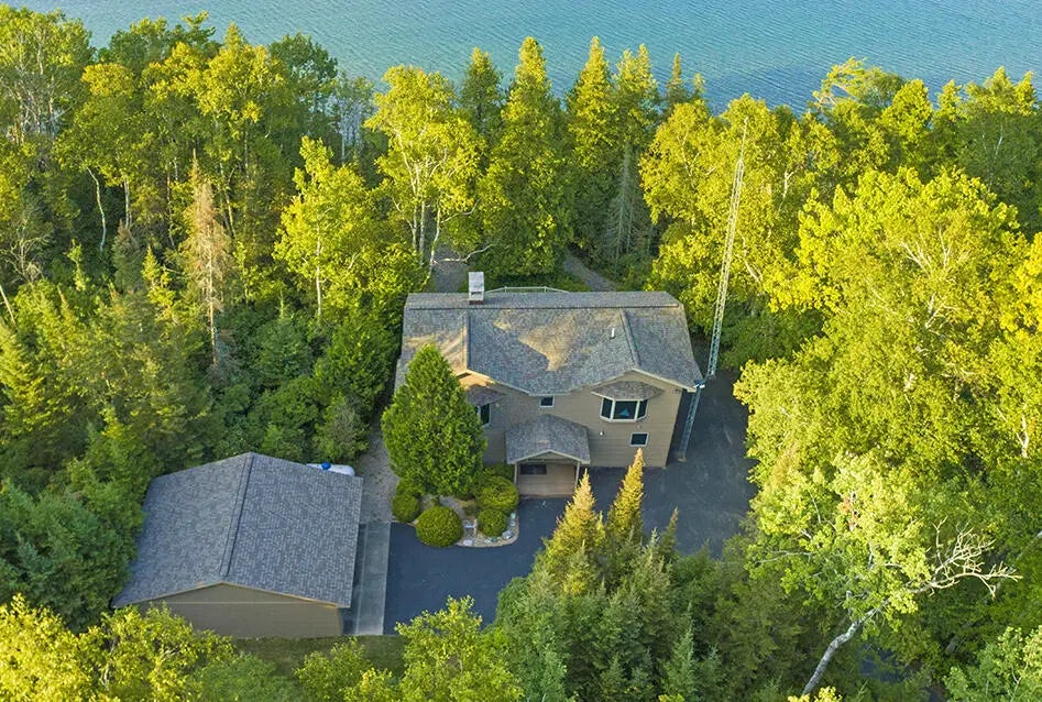 Charming 2,306 sq. ft. fully furnished turn key home completely remodeled in 2007 with impressive open floor plan, spacious updated kitchen, large living room with vaulted ceilings, large lakeside windows, double-sided fireplace, impressive formal dining area, main floor primary suite with double vanity and jetted tub, half bath powder room for guests, upstairs, office and family room wrapped in tongue & groove solid oak paneling, with large bay windows, full updated bathroom, and 2 bedrooms, each with stunning lakeside views, upstairs balcony with impressive picture window overlooking North Bay, Lakeside composite deck, firepit surrounded by bench swings overlooking immaculate Lake Huron shoreline, with lighthouse view, private, wooded double lot, paved drive, and 2.5 car garage.