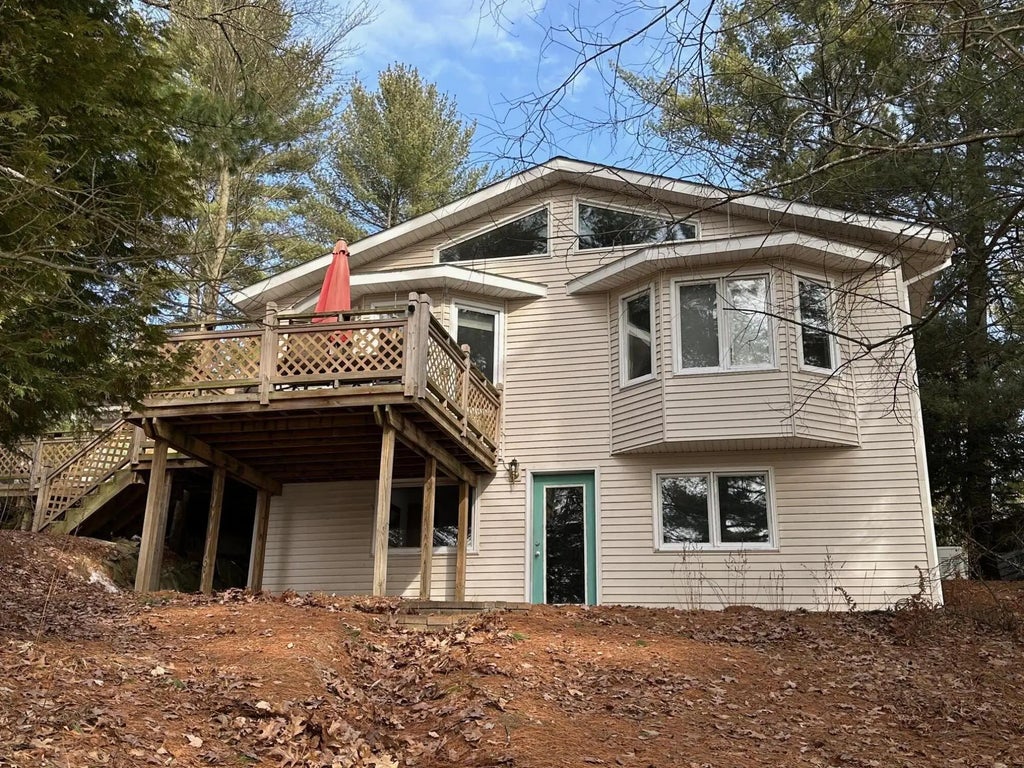 An up-north beauty located at one of the widest portions of Crooked Lake - a premier fishing lake. This 4bd/3ba home has an open concept living room/kitchen and dining room, a master suite with views of the lake, and now a brand new 6'' dedicated water well! Check out the stunning solid oak spiral staircase that leads to the walkout basement with a family room, an exercise/multi-purpose room, and unfinished rooms waiting for your vision. Outside there's a deck with two seating areas overlooking the lake, a permanent dock and a back-up Generac generator. A 24'x32' pole barn serves as the garage and workshop area. There's also a fenced kennel and 24'x24' bonus structure for your use. Make this your permanent home or income property. Recently suveyed and staked, this property is a must see!