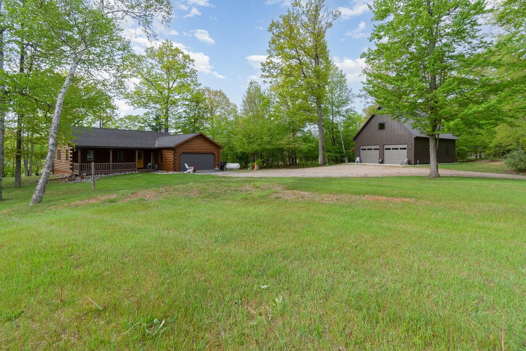 Welcome to English Point, a stunning retreat nestled on a picturesque peninsula. This exceptional 1.26-acre property offers a rare combination of privacy and tranquility, enhanced by 204 feet of beautiful Wixom Lake frontage. At the heart of this peaceful setting is a custom-built log home that captures the essence of up north living. The home features 1,200 square feet on the main level, complemented by an additional 600 square feet of finished space in the walk-out lower level. An attached garage provides convenience, while a detached 32x40 outbuilding—constructed in 2022—adds incredible versatility. This newer building includes concrete floors, electricity, and a finished upper level that serves as bonus living space. As you enter the property from a private road, a long driveway leads you to the welcoming covered front porchan ideal spot to relax and take in the natural surroundings. Inside, you'll find gleaming wood floors and a warm interior of log and knotty pine walls. The open-concept kitchen and living area features vaulted ceilings with exposed log beams, a wood-burning fireplace with a fieldstone surround and custom mantle, and large windows offering serene lake views. A sliding glass door opens to an expansive lakeside deck, perfect for entertaining or simply enjoying the scenery. The kitchen is fully equipped with all major appliances and includes an eat-in dining area along with a second slider to the deck. The primary bedroom features a private half bath, while two additional bedrooms and a full bath complete the main level. Downstairs, the spacious family room provides a cozy gathering space and doubles as overflow sleeping quarters, perfect for visiting children or grandchildren. This home is being offered fully furnished with items thoughtfully chosen to complement the style and comfort of the property. Additional features include a Generac generator, whole house water filtration system, central air conditioning, Spectrum Internet, and a dockmaking it move-in ready and equipped for year-round enjoyment.
