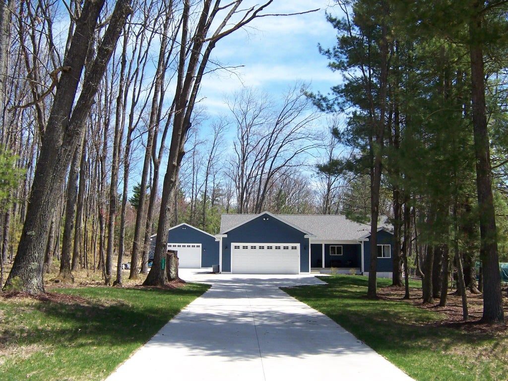 Almost new, custom built in 2022, on a beautiful 1 acre wooded lot near north Higgins Lake. Situated conveniently between I-75 and US 127, and 2 miles from the North Higgins Lake State Park entrance for lake access. The main level offers 3 bedrooms, 2 baths, great room design with cathedral ceiling. The finished lower level (13 block) consists of 1 or 2 bedrooms, a 3rd bath, huge family/game room, office area, and mechanical/storage rooms. Large 4'x6' daylight windows provide endless natural light into this area. Some of the many quality features include: 2X6" exterior walls, 6 inch well, Generac generator, Merillat cabinets with granite counters and quartz in all baths, engineered hardwood floors, 6-panel solid doors with lever handles, lighted closets, immediate hot water system, hot/cold water in finished attached garage, and gutters. Detached garage is 30x40, insulated, finished drywall, and heated by natural gas. Ceiling is 12' tall, 16x10 overhead door, with 220 volt electric service. Extensive concrete driveways and sidewalks. The adjoining lot no. 4 is available for buyer to purchase. This quality home is ready for the next discriminating owner.