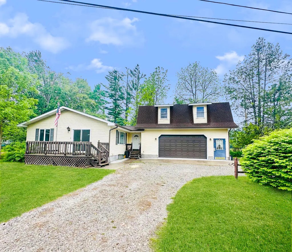Appealing 3-bedroom home featuring a finished, heated, 1-car attached garage, situated on a corner lot in the village. The interior has been freshly painted throughout, complemented by a brand-new patio door leading to a deck off the living room—perfect for relaxing. Above the garage, you'll find a 460 sq. ft. studio apartment, office or just use for extra storage space, is complete with a skylight and a modern split heat/AC unit, offering additional living space or rental potential.