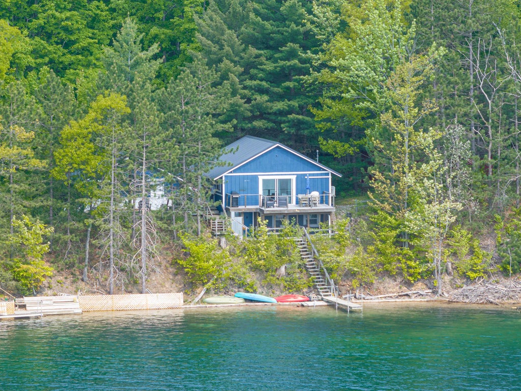 Discover your dream retreat at where tranquil lake life meets modern living. This recently updated home offers an impressive lake view, featuring 116 feet of pristine waterfront on the serene Starvation Lake. Enjoy evenings by the fire pit or relax on the spacious deck, perfect for soaking in the beautiful surroundings. Inside, the inviting living area boasts a natural gas fireplace, enhancing the cozy atmosphere. New kitchen features sleek solid surface countertops, designed for both functionality and style. The property is designed for leisure and entertainment with a finished basement area featuring a wet bar. Step outside to an outdoor shower, a perfect touch for refreshing after a day of fun on the water. A screened-in porch invites you to enjoy the fresh air.