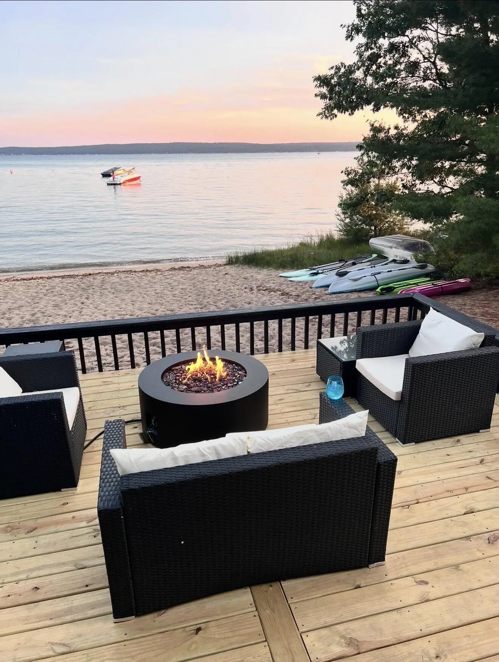 Higgins Lakefront! Perfect East Shore location on Triangle Drive with gorgeous sunsets! Enjoy 50' of private sandy beach at this stunning lake house. No shorefront road exists - ''paper'' or otherwise. The lake frontage is owned exclusively by parcel. The Scandinavian style features a beautiful interior with many finishes that were recently elevated, including granite kitchen countertops, KraftMaid cabinets with glass upper doors and wood interiors, floating shelves, Kohler faucet, stainless apron-front sink, and all-new stainless appliances with a wine fridge! Solid maple hardwood floors flow throughout. Adding to the Scandinavian design are spruce tongue-and-groove ceilings and exposed beams. The shiplap walls, chandeliers, and the wide trim style really bring out the modern design. Relax on the double lakeside deck and take in breathtaking sunsets through the extra-large windows!