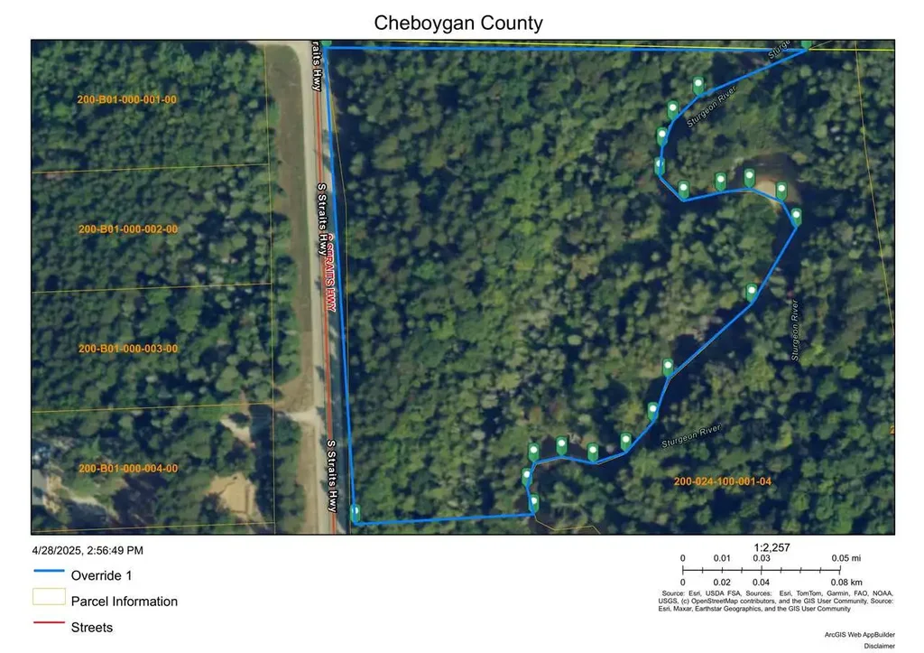Approximately 10 wooded acres on the beautiful Sturgeon River to be split from parcel# 200-024-100-001-03. Seller is willing to split this acreage into smaller parcels, but not less than 2 acre parcels. This property begins at the northern end of the parent parcel, on the east side of S Straits Hwy. across from the Berry Creek Rd. sign. Walk approximately 800 feet south, to south end of the property. See plat map in photos.