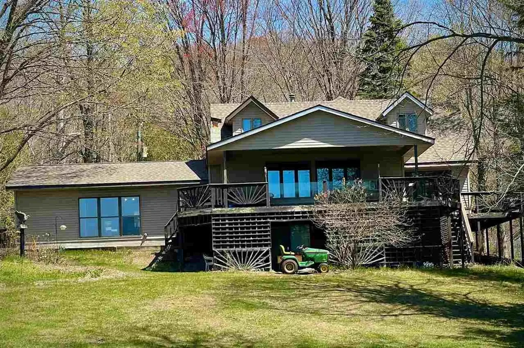Extraordinary quality built, contemporary style home on Estate size 3 acre parcel with 360 feet amazing frontage on popular Lake Saint Clair being part of upper chain of lakes and located just north of Village of Ellsworth. Special features begin with small one bedroom one bath, bungalow guest cottage, right next-door, which would make great rental (bungalow in need of refurbishing) also panoramic lake views from main house and cottage, total house wraparound decking overlooking lake and babbling creek running along whole North side of property, huge bonus rec room with bar and Coy fish pond, detached garage, new furnace, new water heater, artist painted wall murals in upper level bedrooms, bath and hallway. Modern solid Countertop island kitchen, formal dining area, spring fed pond with gazebo area in mid yard overlooking lake, foyer entrance, laminate flooring, wood stove back up, and the list goes on!